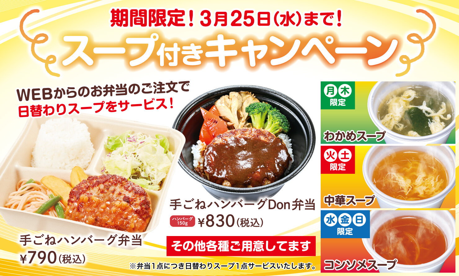 ~ ドリンクバー、スープバー付メニュー ~ 【実施店舗】 帯広中央店、札幌南円山店、札幌山鼻店、厚別店、岩見沢店、函館昭和店、苫小牧澄川店、 室蘭中島店、北見三輪店、北見大通店、盛岡みたけ店、仙台宮城野店、多賀城町前店、 会津若松店、新発田店、ひたちなか田彦店、西那須野店、春日井店、宇治六地蔵店、園田店 ※盛岡みたけ店は土日祝のみの実施となります。